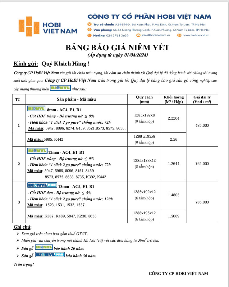 Bảng giá niêm yết sàn gỗ Binyl